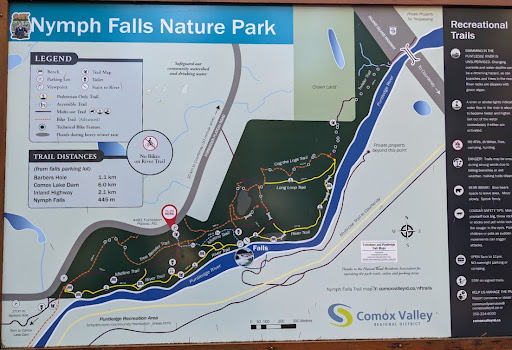 Nymph Falls Nature Park exceeded our expectations for an easy but varied forest walk. We took the main (Midline) trail, most of the River Trail, and a bit of another trail for 90 minutes (including 15 minutes meandering around the falls). Managed by the Comox Valley Regional District and Forbidden Plateau Road residents, the park is less than 15 minutes drive from Courtenay.