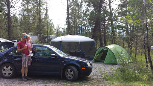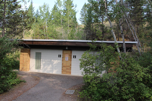 small off road prov park. quiet. clean. nice size spots. yes one bathroom as other say, with running water. flush toilets, no shower. There are other pit toilets as well. Not great for kids to bike around. pretty steep paved loops around camp sites. Great for quick stops, adults, going from camp site to day trips from here etc. convient if going to Radium Hot Springs pools. -Town has a few small convient shops. -Ft Steel in just over an hour south. Banff is about the same distance north east. -Gas is 10 cent a litre cheaper in Ft Steel@ 127.9 and Radium 135.9 at this time. -A time change was unexpected...
