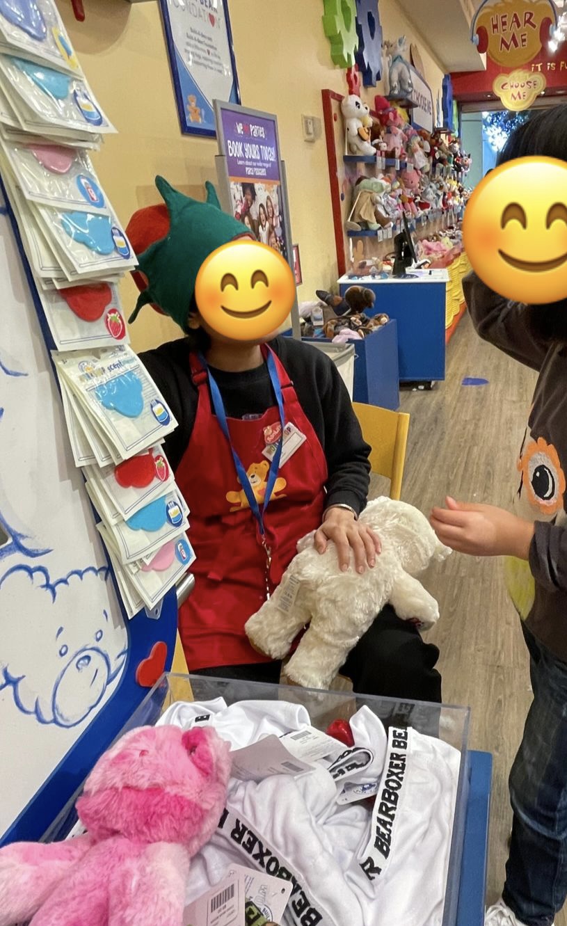 I had my bear stuffed by Erika and she was so patient and kind. She was nom-stop stuffing bears, but she handled it like an expert. Caleb, (who I think was the MoD) was so efficient and people oriented. I was amazed at how he made sure to check on everyone, despite having his own hands full! And Alissandra was quick and efficient on till, making the line up...