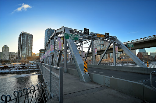 The Reconciliation Bridge is an oldish truss bridge originally built in 1910 and originally called the Langevin Bridge (named after Sir Hector-Louis Langevin, one of the fathers of the Canadian Confederation). The bridge took on its new name in 2017. The bridge is a typical structure for the time it was built, and is the third oldest of 4 surviving examples of this type of bridge in Calgary. Truss bridges, i.e. bridges made of interconnecting triangular units, look like an engineer's dream. It looks like its made of giant Meccano. The bridge is attractive during the day and well lit up at night. The bridge connects into the Bow River Pathway system, and has pathways for pedestrians to cross the river (as well as cars).