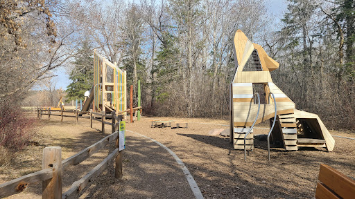 Wood chips and 2 very large wood natural looking structures. Only good for +5yrs nothing for babies and tots... My children liked the bouncy leaves the most. Very small and no parking...very hard to find, we found the tiny climb area with sandpit first and then drove around the entire park. As we were exiting we saw in between the trees...so I kind of parked close to the entrance??? Not sure, still confused. Probably will not be back for 5+ years ๐ The woods are great for shade and trails but also a lot more bugs then other...