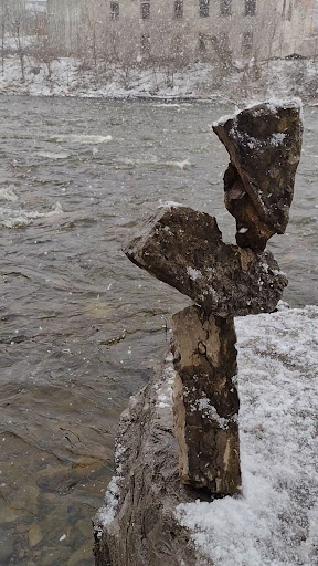 The photos and video are of some balanced rock sculptures left along the riverbank by an unknown artist. We were very lucky to have gotten to see these before the wind...