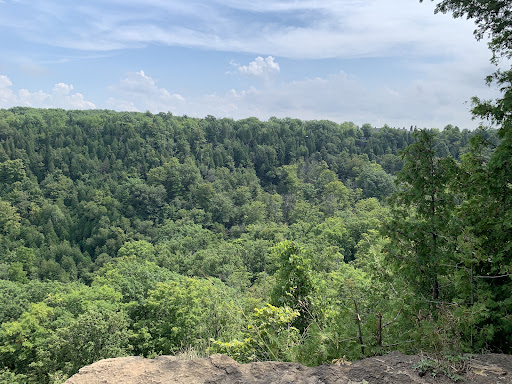 This was the third trail I tried in Hamilton and the only one of the three that didn't have a constant highway din, so that's something. The upper trail views are nice, though I don't know why they need those ugly metal towers marring the landscape when you can just stand on the cliff and look out. The lower trail to the stream is a steep descent and a bit rocky after the stairs. I'd be wary of doing it when the ground is damp, as I imagine the railroad tie steps get slippery. The steps are tilted at points, with no hand rails or anything else to grab. After that steep hike down it was disappointing to discover there was no water in the stream, only stagnant pools breeding mosquitoes. I didn't realize I needed to continue past the end of the upper trail to see Beamers Falls, because the kiosks at the start of the trail oddly don't include a trail map or any info as to where the waterfalls are, and the All Trails map I followed doesn't include it in the route. I ought to have looked more quickly at the Google Map; you have to emerge onto the road to get to the falls. I got in some good exercise climbing back up from down below, but this hike was...