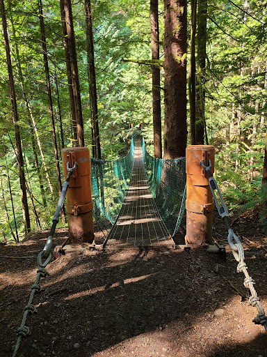 The trail is well marked with orange markers in the trees 🌳. There is also a very fun suspension bridge about halfway through or so. Don't look down if you're scared of heights! If you run on the bridge, it will sway, so take your time and walk steadily to avoid scaring others. The bridge itself appears very well built, and has high sides with thick cables.