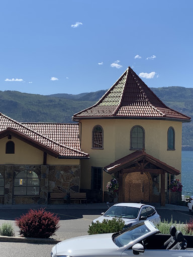 Most tourists, like us, approach Gray Monk from a road with a long right-hand loop down a steep hill, allowing you an extended view across fields to a mustard colored basilica, a common color with wineries I’ve noticed (Burrowing Owl, Cassini Cellars, Gold Hill, Ruby Blues, Perseus…you get the idea). This is a mere sliver of what awaits.