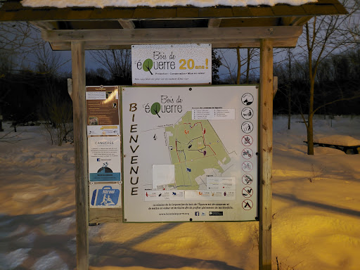 Bois de L'equerre, French for Forest of the square (as in the carpentry tool) is a nature park with free parking and walking trails that welcomes dog owners (keep your dog on a leash) and includes nicely maintained trails through wooded areas. Walking trails are between 400 meters to 4 Km. There is a small network of flat, easily traversed walking trails and with some presenting a bit more challenges, and may include some muddier terrain and some slight inclines and having to negotiate around branches, rocks, etc... It is a wonderful little piece of natural heaven in the heart of the city of Laval. Within a few minutes of much of the Chomedey industrial park, it is a little hidden gem which is great for the worker bagging it for lunch and is looking for a special place to commune with nature while enjoying their sandwich. The park also features organized nature interpretation walks, has a covered picnic table area and descriptive panels (French only) with information on different animal and vegetation found...