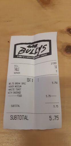 Read moreBully's is a place I recommend to anyone that wants a good breakfast for a good price, what makes it the best is there's lots of it, the wings,cowboy burger and bully burgers make me hungry, they are by far the best in town the Caesars these guys make can't be beat in Lethbridge and the cheapest for sure the staff is super friendly and deserve a big applause clap clap...