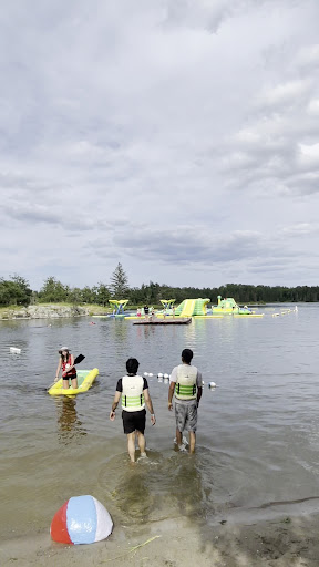 The staff were polite, friendly and vigilant. Rules were explained to everyone prior to starting and were enforced on an as needed basis during our session. The current limit of 30 people per session felt just right, as there was lots of space for everyone to spread out and explore the different elements. The two adults in our group enjoyed the workout of maneuvering through the course, and the little guy had an absolute blast flinging himself through (and off) the obstacles and slides. This was hard work for a couple of overweight adults, but an absolute blast! Life jackets were mandatory (and provided) and we definitely appreciated them after an hour of slippery, splashy fun. Parking is available for free and it was easy to find. Definitely worth...