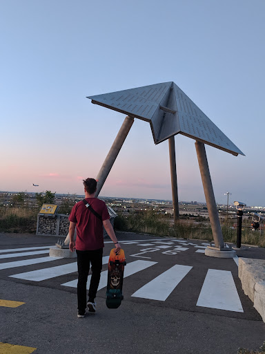 The Final Approach: Danville Terminal, at the north end of the park, is located at the highest point of Danville Park and is built on an aviation theme, since planes taking off from and landing at Pearson Airport fly past. There is a steel sculpture that resembles a paper airplane, binoculars to view planes and the airport, interpretive plaques highlighting aviation history, and paint markings resembling an airport runway and flight apron.