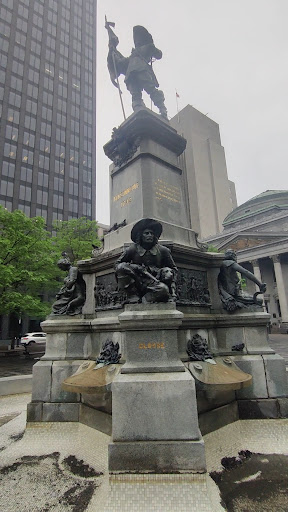 What you see is a bronze of Maissoneuve in period attire, holding up the King of France's flag while he looks up towards Notre Dame Cathedral. He stands upon a decorative base with four additional bronzes representing prominent early figures Charles Le Moyne, Lambert Closse, Jeanna Mance and an Iroquois warrior. There are also four bas-reliefs depicting early moments in the city's history.