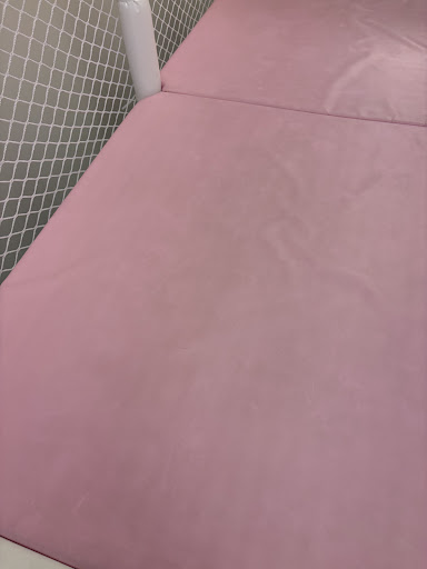 Cleanliness was another concern. As you can see in the photos, the pink and white padded flooring was really dirty — which is surprising for early in the day. The one and only washroom on-site had no mirror and was also already in rough shape. There was a handwritten sign directing people to Walmart if it was “urgent,” which says a lot.
