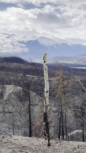 Maligne Lookout, even after the wildfire, holds a haunting kind of beauty that speaks volumes. The charred trees stand like silent storytellers, whispering tales of resilience, wild winds, and the animals that still roam freely through the recovering landscape. There’s something powerful about standing there, feeling the breeze weave through the skeletal forest, and realizing that nature, even in its scars, is breathtaking. It’s a place that reminds you of the strength of the wild and the quiet hope...