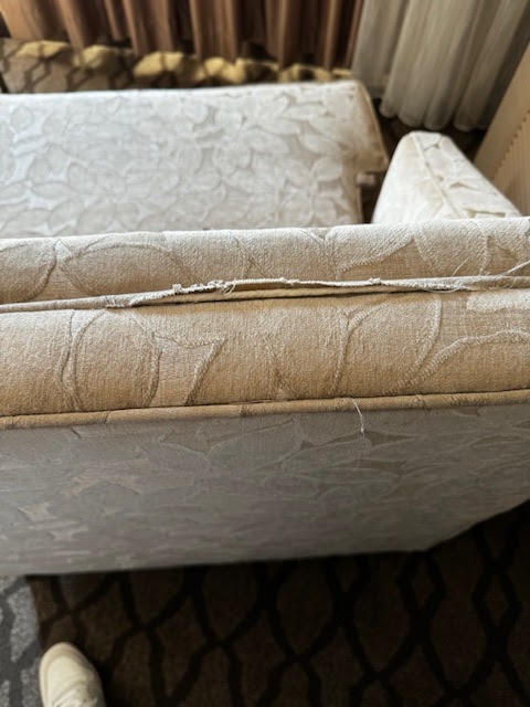 Sofa in front of the window: The upholstery was falling apart and under the cushion was a thick layer of dust (do they have vacuum cleaners in the hotel?) (viz pic)