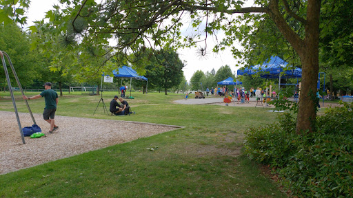 This is a popular park. Several teams or groups playing games, lots of people walking dogs and the fields, many other walking or running around the edges. It is nice seeing the gardens at the South end, and having places to play little games like badminton when there's larger soccer games going on in other places.