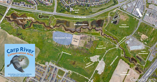 Read moreA Living Classroom will be developed here in the future, which will animate the river and its wetlands. Phase 1 launched in Nov 2020 and includes interpretive signs, a downloadable brochure and citizen science projects in iNaturalist. EcoTrekr, a free mobile App (on Apple App and Google Play), was launched in June 2021 for the Carp River Conservation Area and is aimed at families and children in elementary and middle school. EcoTrekr helps visitors understand and engage with what they see as they walk the paved trail. Features GIS-triggered pop-ups describing site features, descriptions of plants, wildlife, geographical features, historical notes and quizzes. Find out more about this project at...