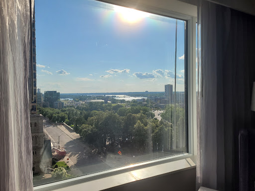 Read moreWe were very pleased with the central location of this hotel for visiting the various attractions in Ottawa. Most of the attractions were walkable within 15 minutes. Further attractions requiring a bus were easy to get to as the bus and Line 1 tram stops we needed were across the road ($3 in coins/ for seniors). We stayed at this hotel for 4 nights. Our comfortable room on the 7th floor had a very good view towards the War Museum and the Ottawa River. If we visited Ottawa again we would certainly use this hotel.||There were no surprises with our room as it was similar to other Hilton hotel rooms we have used. The room was very comfortable with open shelves in the closet for storing clothes rather than dresser draws. There was a range of TV stations, even one channel for Parliamentary sessions, and, of course, WIFI was free. The room's safe is at floor level! We did like having a microwave and a small fridge in the room. A convenience store was a block away on Albert Street for milk to go along with the oatmeal packets we had brought along as well as our own coffee cups and spoons. The room just has paper cups and wood stir sticks. The bathroom had those squeezable bottles for body gel, shampoo, and hand lotion, but one can ask for a bar of soap. We were too busy sightseeing to use the pool. There were computers for use in the business area. Staff helped us in printing out our boarding passes and in ringing a cab for us. ||Breakfast is like those in hotels that offer a free breakfast with the room, but at this Hilton there is a $20 charge. We did use the Tulip Cafe for dinners though. Expect to pay $20-$30 without drinks. We enjoyed their soups, salads and sandwiches especially. There is a Tim Hortons (closed after 5pm) across the street on Queens and a wonderful bistro called, Occo, on Bay street which we used too. Otherwise, there are no cafes or shops nearby. The Lyon West station building across the road from the hotel was under construction so in the future there may be eateries in that building. The buildings on the streets leading to downtown are office buildings and if there is a food center in them they close at 5pm if not earlier. There is a small selection of pubs/cafes on pedestrian Sparks Street from Bank to Elgin Street - about a 12-15 minute walk from the hotel and a few other choices around the Hotel Laurier area. ||The hotel area is very quiet considering one is just at the edge of downtown Ottawa. We enjoyed our holiday in Ottawa and had a good hotel to come back after...