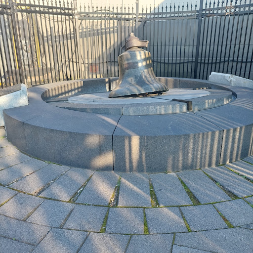 This monument is showcased on a circular granite base, which is etched as the face of a clock to represent the bell's role in keeping time. The bell sits on an incline, recalling its position in the ground after falling from the Tower.