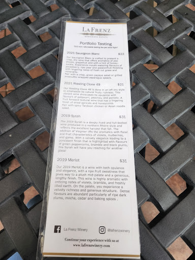 Read moreI have always enjoyed visiting La Frenz because I enjoy many of their wines. They have changed their tastings to a sit down tasting. We were under a bit of time pressure but thought 25 minutes was going to be enough time for a tasting. It was a busy weekend but predictably so for a long weekend. We only managed to taste one wine in that time as our server was occupied at the till with two groups purchasing wine. We eventually got up to leave and were then noticed by other staff who said we would be served. By then we had to leave so made a purchase of the one wine tasted and left. We were disappointed we didn't get a full tasting and would have bought more wine. When we checked in we made it clear we were happy with a stand up tasting at the bar but there was a priority given to seating groups. The setting is pleasant and if one has plenty of time to lounge on a patio with long intervals to ponder your empty tasting glass that is fine, but if you are there to taste and buy I strongly suggest you just head for the old style tasting. They need a person to do till only and allow...