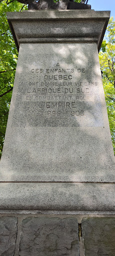 A park of contentment holding reminiscences of past contestations, as revealed by various political and war commemorations. In a sliver of the park running parallel to the Rue Saint-Louis stands a bold monument in Imperial style commemorating the dead who fought in the Boer War. This was a war not supported by the Canadian public (as elsewhere in the Empire, such as Australia), and in the end only volunteers joined the Empire's forces. Eleven did not return alive, and their names are written on a bronze plaque attached to the plinth. Atop the plinth is a bronze statue of a soldier holding a flowing flag. It was unveiled on 15 August 1905 in the presence of Lord Grey, Governor-General of Canada. Distant in time, distant in purpose, a disaster in...
