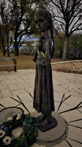 A nice way to honor the memories of the millions people who died in the Ukrainian genocide from 1932-1933 engineered by Stalin's troops. The statue itself is called " Bitter memories of childhood " , is a little creepy if you don't know the history behind this beautiful work of art. The surrounding area was beautiful and picturesque as there is a waterway nearby. The university of Regina is within walking distance. There are other statues nearby as well. There is plaques behind the actual statue as well as an inscription on the back near the little girl's feet. Not sure what it says but I will find out and post it later on...