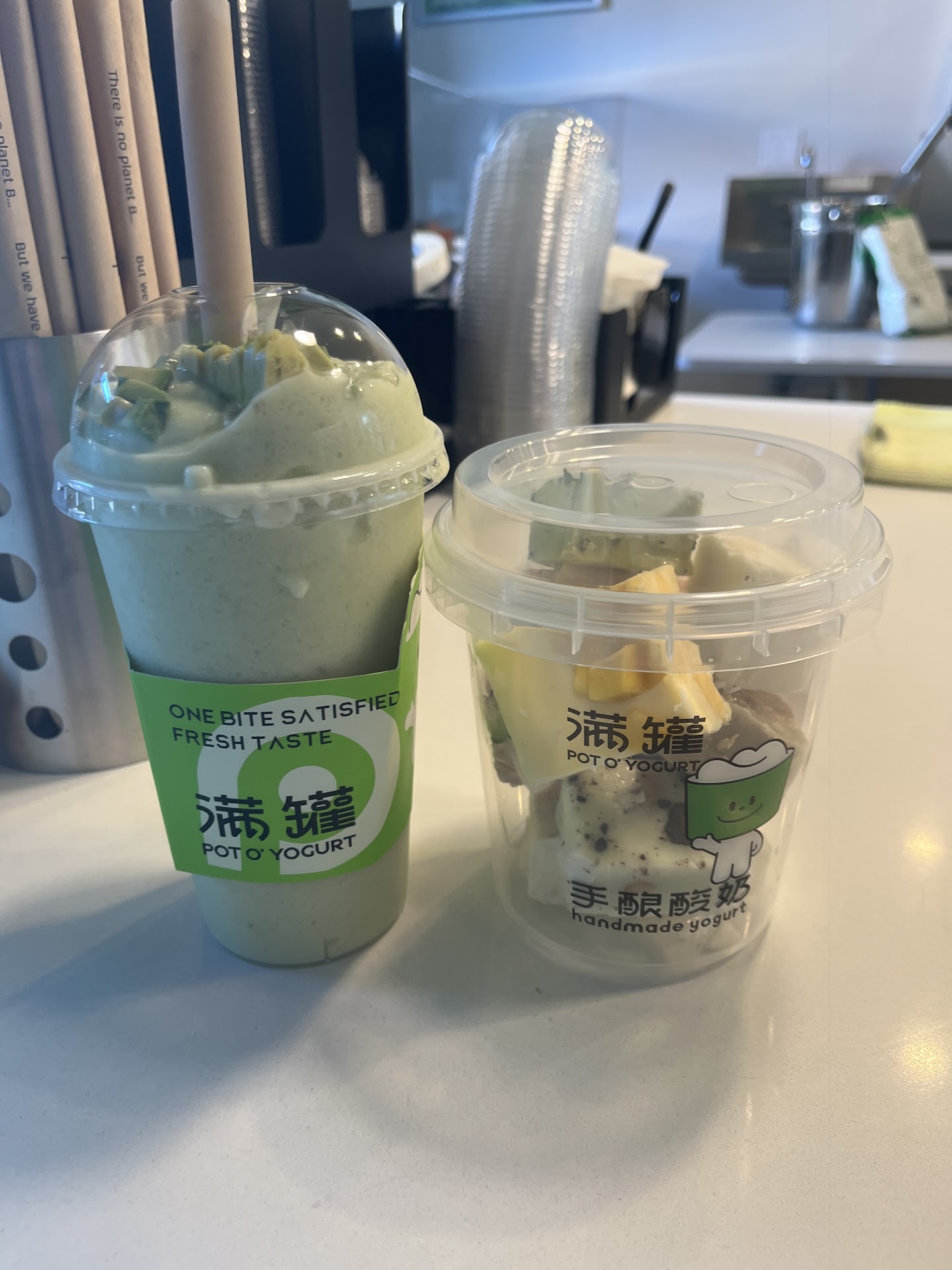 We got the pistachio avocado yogurt and strawberry avocado drink! And a piece of the lychee yogurt ice cream cube! The drinks have no customization for sugar level but wasn’t too sweet for someone who usually gets 30% sugar on drinks! was very fresh/ 真材實料 and very good!! i like that the drinks tasted quite healthy! however, i can imagine people who have a sweeter tooth may not appreciate it or may not like it as much so it’s not for everyone. the pistachio avocado had a generous amount of pistachio pieces inside and added to the texture! imo, the drinks weren’t too icy for me! the yogurt cubes surprised me and i loved the lychee yogurt ice cream pieces and would love to try the other flavours too!!. first bite i can taste the lychee, then you slowly taste the yogurt more. texture is also good and not icy at all!! Very creamy! Staff...