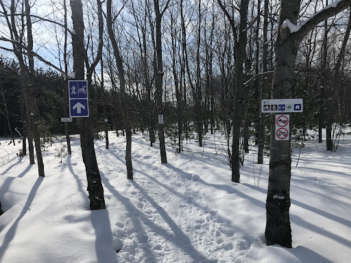 Il y a un très grand stationnement, avec des toilettes, 2 tables à pic-nic la carte des sentiers. Nous avons fais R2 qui débute de l'autre coté de la route. Il faut faire attention de suivre les affiche bleu de marcheur a raquette...