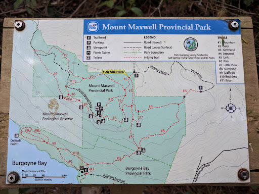 Read moreThis Provincial Park offers amazing almost 360º views of the surrounding coastal area. You can see the beautiful Burgoyne Valley and Bay and a number of the adjacent islands. The main trail goes along a tall cliff leading towards the highest point of Mt Maxwell. The pine trees provide for a beautiful smell along the way. I believe there are few ways to get to the top, one from the road and another from Burgoyne Bay. The trails and viewpoints are well marked. We saw a few picnic tables at the top, close to the parking lot. The road goes all the way up to the top of the mountain, but there are a few parking spots lower down the road, for those who do not have a car with much clearance or are worried to drive on a dirt road. The hike is a nice addition to a day, easily doable in 30-45 minutes with plenty of time to...