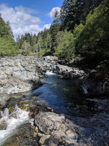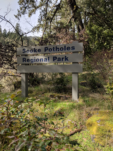 There are two adjacent parks plus a campground along Sooke River Road: first, Sooke Potholes Provincial Park, 7 hectares then, Sooke Potholes Regional Park, variously reported as either 55 or 63 hectares then the campground. Which, to add to the confusion, can be found under multiple names - Sooke Potholes Campground/Sooke Potholes Spring Salmon Place Campground/T'Sou-ke Nation KWL-UCHON (spring salmon place) Campground.