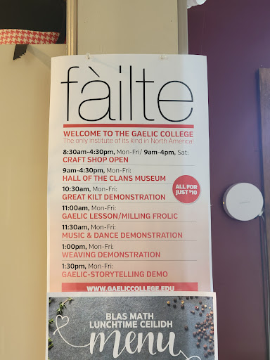 Read moreStopped in on our way down to baddeck and couldn't have enjoyed the trip more. The campus is gorgeous and the effort put into teaching Gaelic language is evident even when you go to the washroom and the soap is labelled. It was a pleasant surprise to be greeted in spoken to on Gaelic and then translated to. It made me want to look further into the subject on my own. The Hall of clans was a fun and interesting set of exhibits but the true beauty is in the demonstrations. We attended in time for a weaving demonstration/talk and the demonstrator was knowledgable, enthusiastic and personable. My wife being into fibre arts was enthralled and we would've gladly spent the afternoon simply taking to this single demonstrator. Come for the history but stay for the knowledge and talent attracted by this wonderful building. I hope they stay open for a...