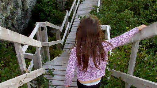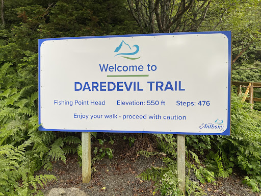 The Daredevil Trail is a good workout up a very well maintained wooden stairway. The day we chose the hike was unfortunately very windy and rainy. However, part of our Westcoast travelling group was up to the challenge. At the top, there is a communications antenna and signage pointing to different destinations in the world. Despite the inclement weather, we still did some geocaching at the top with success. On a clear day, it would be a beautiful view of St. Anthony's harbour. Nice hike when in...