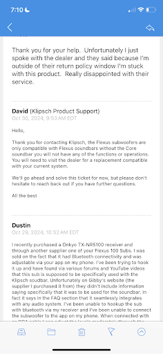 Earlier this summer my firm was building a luxury, turn-key, oceanfront cottage. As a curated and furnished project we required a subwoofer which fit the aesthetic of the space and furniture. We found that the Klipsch Flexus Sub100 fit our needs from an aesthetic standpoint, had Bluetooth capabilities to accommodate a range of placements and as it’s built in part with Onkyo would compliment the Onkyo receiver and Klipsch speakers installed throughout the house. Upon install we were unable to pair the subwoofer with our receiver and Klipsch app so we decided to try hardwiring the sub conventionally. While this did power the Flexus Sub100 we found that even by “maxing” the controls on the Onkyo receiver the subwoofer added very little bass to the overall audio experience; bass-heavy music such as house and rap had muffled and marginal outputs. As I’ve had multiple, custom home and car audio systems I knew the results weren’t indicative of what should be expected. I returned to Gibby’s website where I re-read the description of the subwoofer as well as their FAQ section relating to the specific device. As read at the time of purchase I confirmed that their site indicated that the Flexus Sub100 could be integrated “seamlessly” into an existing home audio setup. With this information I contacted Klipsch Customer Support directly as I assumed the issue was perhaps with the subwoofer and not with a misleading statement on the sellers website. Unfortunately, the Klipsch Rep responded promptly indicating that the subwoofer I purchased was ONLY compatible and adjustable with the Flexus Soundbar. On finding this out I then reached out to Gibby’s Customer Support to find out if they had any suggestions as to how I could move forward as I thought perhaps there might be some sort of workaround that the Klipsch rep hadn’t suggested for one reason or another. The response I got from Andrew was succinct and essentially - tough luck, you can’t return it because you purchased it too long ago. I was flabbergasted that was the only response I received. When given the opportunity to make an additional sale and perhaps apologize for a misleading statement on their website, Andrew instead responded by saying I couldn’t return the device - an answer to a question I never had asked. Perplexed I emailed again, this time cc’ing the store manager expressing my concerns and confusion while again citing the issues. This email apparently didn’t even warrant a response as it’s been a couple weeks since it was sent. In a time when competition from companies overseas is rampant, it’s always puzzling to me why “local” businesses do their easiest job so poorly. The importance and ease of building relationships with a loyal customer base through exceptional customer service is clearly and sadly overlooked by Gibby’s. If I wanted to return the subwoofer in question I would have simply and clearly asked “can I return this?”, instead I asked for potential solutions to my problem and was met by a matter-of-fact response which didn’t address a single thing outlined in my email. An apology for a misleading FAQ section and confirmation that Kilpsch’s response was correct would have been disappointing but satisfactory. Asking what my current audio setup consists of and a tailored suggestion as to how I could make it better with a couple different and suitable subs would have been outstanding. Instead I was essentially ignored after having spent the better part of $500 on a single component. With more projects underway I’ll be sure to steer clear of Gibby’s despite having a few colleagues and friends recommend them (all of whom agree they’ll take their business elsewhere) and I’ll be sure to let clients know of my experiences. It’s clear through online marketing Gibby’s is concerned about their overall image; but based on my personal experience it’s clear that they’re a business who isn’t concerned with individual customer care after they’ve made a sale. Rated 2 stars simply because the correct product shipped in a...