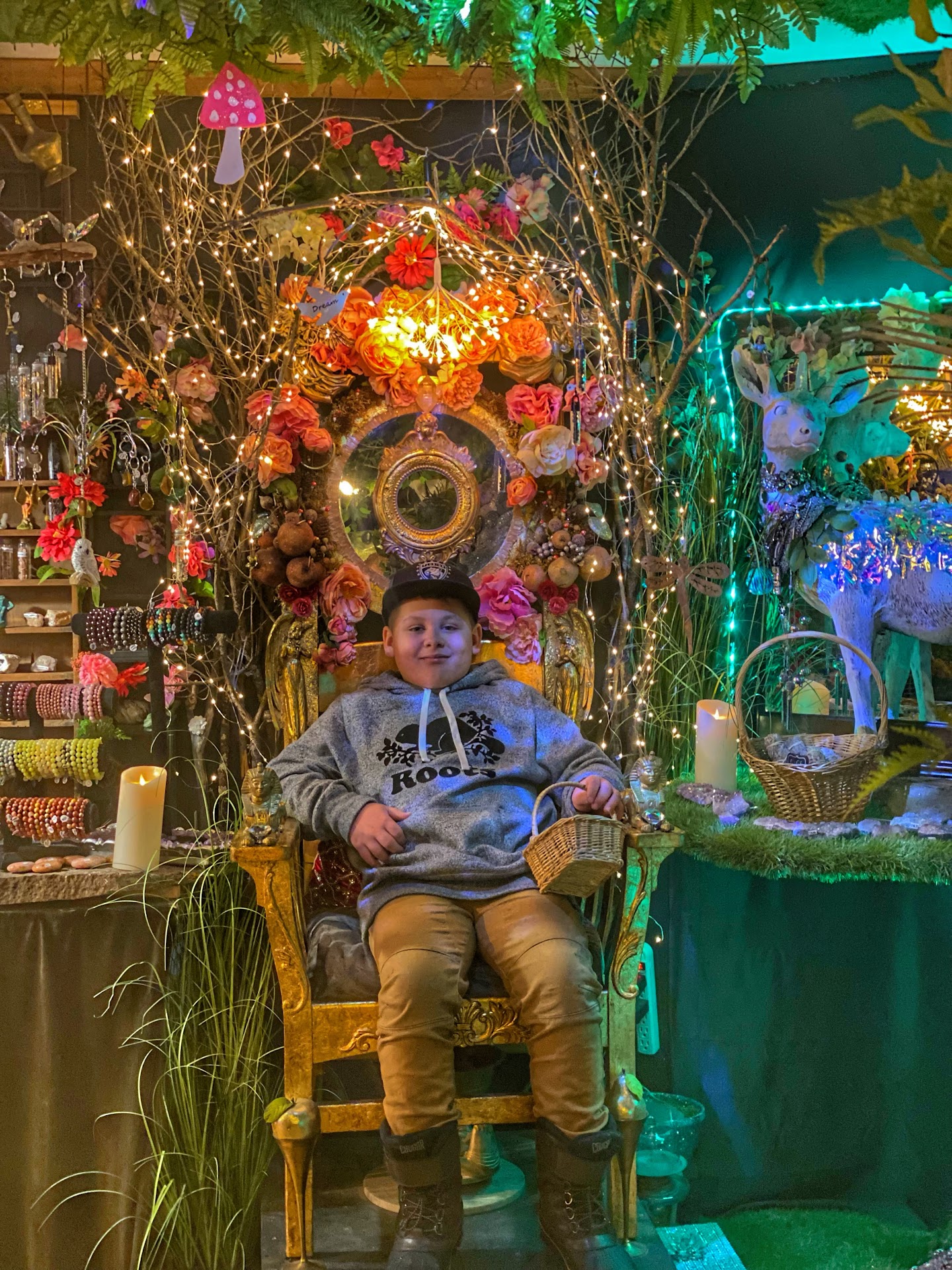Using mostly found materials she has crafted an enchanted fairy forest, complete with the sound of running water and little fairies living among the fauna and crystals. Definitely check out the hand crafted magic wands and the mossy terrariums hanging in the windows. Braylin is a very creative and engaging person, and her work is amazing.