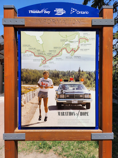 This is such a beautiful memorial. What I remember from being the same age as Terry and from the same area he was a very humble person who shied away from the spotlight as much as possible while still promoting his goal of raising money and awareness for fighting the battle against cancer. Almost 23 years old and he did more for others than most people do in a long lifetime. The memorial is perfect. It tells Terry's story and is understated what he did bringing Canada together. Elementary kids still learn about him and hold annual runs to raise more money. It was such an emotional visit for me. I never knew him, but I am so proud to know OF HIM. And oh yes, the view is gorgeous looking out toward the Sleeping Giant and the islands. Luckily I arrived before sunset because when I returned the next morning the smoke from northern fires descended over the region and I couldn't see...