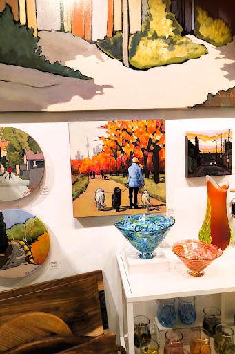 On a rainy day when I'd rather have stayed cocooned at home, I came to a neighbourhood entrepreneurs event at Blue Crow and... fell in love. It's been around for a while, and moved into this spot relatively recently. While it was a grey day, the light walls emitted a brightness and warmth. The Canadian art and crafts available at pretty much every price point, the ideas the art gave me, the fun and the phenomenal, all mean I will be coming back for great gifts and maybe, just maybe, a beautiful painting (not shown here - don't want you to snatch it first!). Staff lovely and the owner Jodi Wheeler was so welcoming. I came way with two beautiful mugs and two one of a kind (OK, may there are a few more) birthday cards that are excellent for the hard to buy for (aka husband). Looking forward to taking art classes later this year. Hats off to the Canadian artists on display there. ...