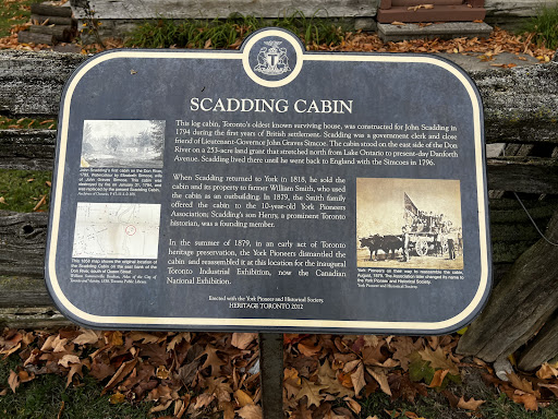 Interesting but historic cabin. The cabin was originally built on the property of John Scadding, an immigrant from Devonshire, in order to fulfill his settlement duties to the Crown. The cabin stood at the east side of the Don River south of Queen Street East on a 253-acre land grant that stretched north from Lake Ontario to present-day Danforth Avenue. Scadding lived in the cabin until he returned to England in 1796.[3]