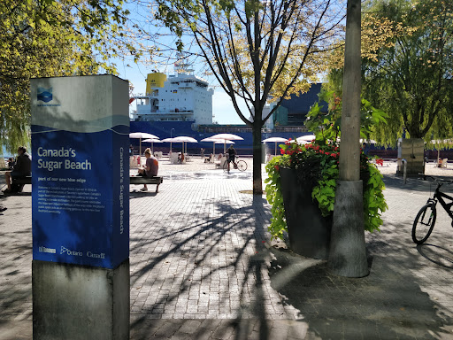 Read moreSugar Beach Park with a bunch of iconic pink umbrellas, sand and rest area with lounge chairs scattered throughout the beach. There's also walkway areas that connects you to the new East Bayfront community as well. It's a pretty nice walk along the waterfront with cyclists and walkers. Or even dine at the nearby Against the Grain to see pedestrians walk by.