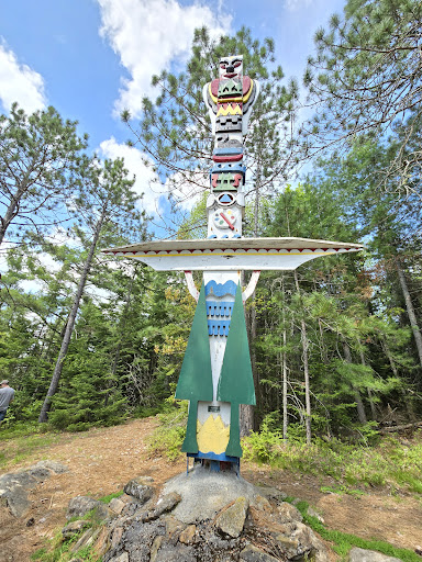 Canoe rental was a breeze with quality canoes (and even paddles for the kids) and the lake was calm enough for the 2.7 km (1.6 mi) paddle (each way) to the memorial. Coordinates for the cairn and totem are ... 45°33'30.9"N 78°42'56.0"W ... with a small dock below for tying up to. Read the history and climb the hill to the totem and cairn at the top. A beautiful tribute.
