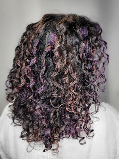 My dark brown curly hair used to be one of my best features but a lot changed during and after the pandemic. It got very long with lots of grey coming in over the crown. The texture is curly type 3A/3B and is prone to frizz and drying out. I was wanting but very nervous about adding purple highlights and cutting some length off my hair, while also covering the grey.