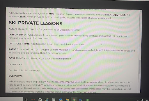 The ski classes were good but inconsistent. There were a zillion teachers (mostly young kids) so that’s good sometimes in that paid a group class but 2 classes I got a private or semi-private) BUT the quality of teaching was inconsistent. Many days seemed like student teachers just stood around too. As teacher is randomly assigned upon arrival each week, could be 1 week have great teacher, another not so good kid teaching and it was a waste. For example first class skiing and we got a snowboarding teacher, was annoyed because my kid couldn’t understand what it should look like, but next class told my kid only follow a teacher who is skiing too so it’s easier for kid to follow. Some classes good but others not so great also bc weather and ice they barely went down harder steeper hill (they tried a few times but also fell bad bc icey conditions which spooked the kids) . Also even length of class varies, supposed to be 50 min class. one teacher didn’t go back up to do another 1 last run and ended after 40 min, but another week I got 60 min because teacher chose to do 1 more run. Some weeks did the runs many times like came down 6-8x? Other weeks only came down like hill like 2x not so active it seemed (they would do a really slow activity at top of hill after ski lift which we couldn’t see as spectators)