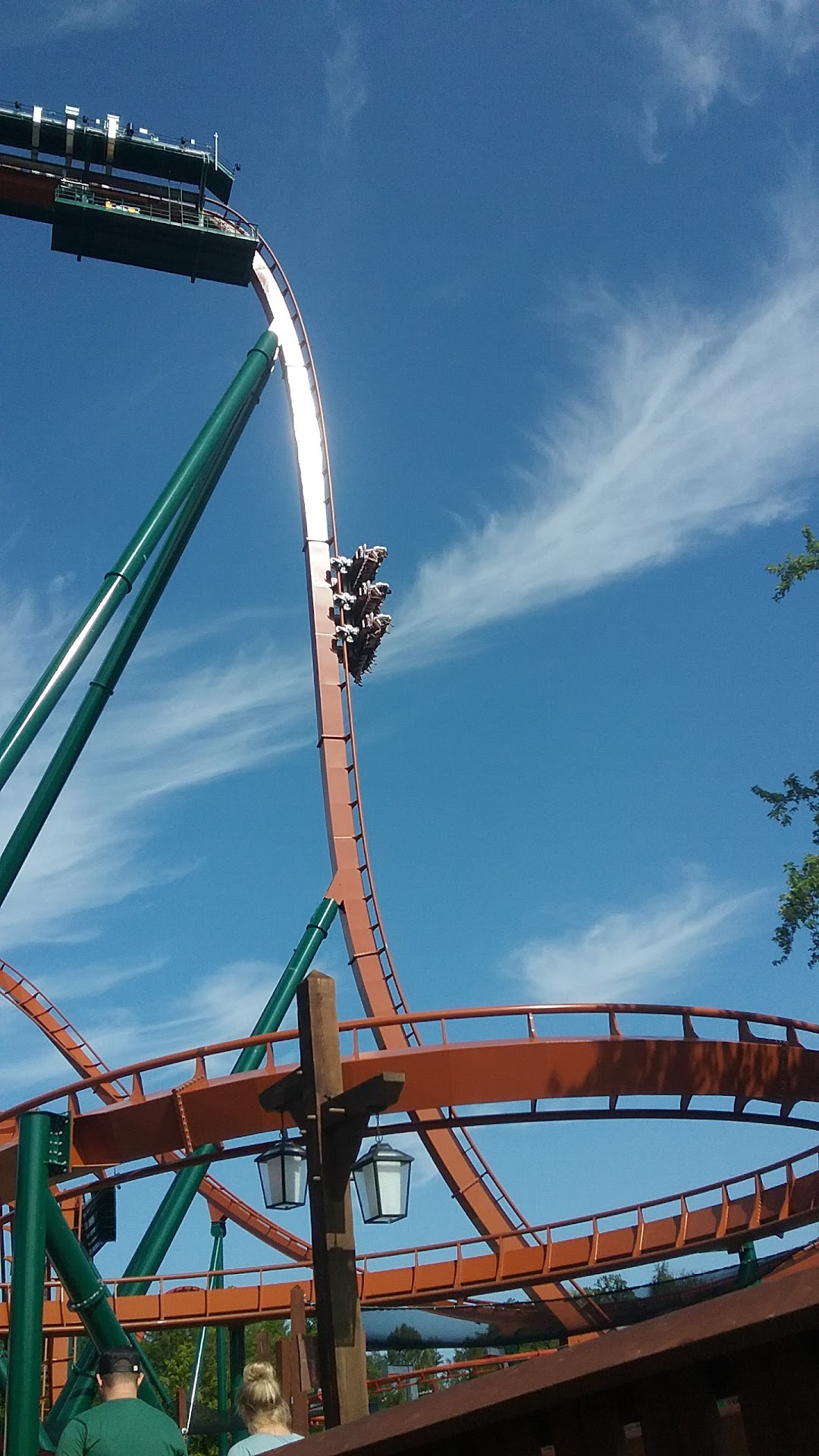 You emerge from the tunnel into a giant immelmann loop that turns you around to face the drop you just braved. It's a bit forceful, and in the back you could get some air at the top. You swoop back down over the water after twisting out, before twisting into a huge, smooth, and floaty zero g roll. Then there are two more loops that are pretty forceful with a trench in between them, and after the last one the ride is essentially over as you hit the brakes above one of the water rides. There's a nice bonus section after this with a small, steep, sudden drop and a spiral over the path before the ride really ends.