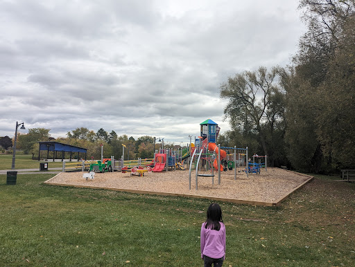 So many different and fun things to do in one park! The surface is wood chip based. A super tall (but safe) main climbing structure with a twisty tube slide from the top. Multiple levels of other slides leading up to the big one. Different types of climbing to get on to the main structure as well as a lower ramp portion. Two big swings and two baby ones along with a disc swing that's a bit high off the ground than what we're used to seeing. Lots of wobble sit ons. A smaller rope climbing frame. One low circular rope net that also spins. Also has monkey bar like area with a sliding portion. Last but not least there is a small musical installation, some with attached soft hammers, on different forest themed metal pieces (leaves, mushrooms, etc). It's all very colourful, and a bit of something for everyone feels like. Right next to a little stream with a bridge that leads over to an open grass field. Great...