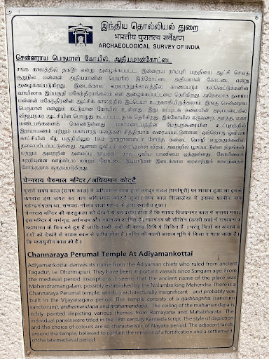 Read moreOne of the oldest and historically significant temples, the Chenraya Perumal Temple, is a Hindu temple located in the town of Adhiyaman Kottai, 7 km from Dharmapuri on the Salem road. Dedicated to Vishnu, it is believed to have been constructed by the Hoysala and Vijayanagar kings, with the most prominent being Krishnadevaraya. Many buses are available from Dharmapuri town to Adhiyaman Kottai, and the temple is just 0.5 km from the Adhiyaman Kottai bus stop…! The temple is maintained neatly and is a good place for studying and preparing for competitive exams without any...