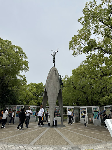 Story of Sadako Sasaki This monument is inspired by Sadako Sasaki, a girl who was 2 years old at the time of the Hiroshima bombing (6 August 1945).Ten years later, she developed leukemia due to radiation exposure. While in hospital, Sadako began folding paper cranes inspired by a Japanese belief that folding 1,000 cranes could make a wish come true. Sadako managed to fold over a thousand cranes before her death in 1955 at the age of 12. Her classmates and friends collected donations nationwide and internationally to build this monument in her memory and for all child victims. The statue is about 9 meters (30 feet) high. At the top stands a bronze statue of a girl (Sadako) holding a golden origami crane above her head, symbolizing hope and peace. On the sides are figures of a boy and a girl representing a bright future and innocence. Around the base are glass cases filled with thousands of colorful paper cranes sent from children and peace groups all over the world every year.