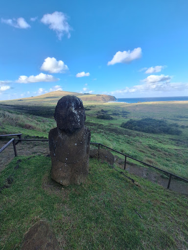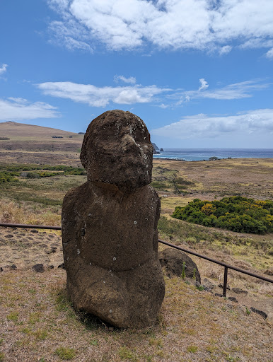 This is for a single, very unique Moai located within the Rano Raraku quarry towards the back of the mountain. Most of these reviews do not reflect this. You need a guide to enter this area. Most Moai are made out of compressed volcanic ash, but this one is made from red scoria, which is a more fragile volcanic rock. It's also kneeling, has a more rounded head l, and has a beard, where other Moai are clean shaven and taller. This statues exact history remains a mystery, but it's extremely neat to see so up close and walk around it. It's definitely worth a stop when...