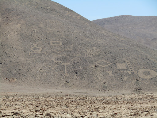 Los geoglifos fueron construidos por pueblos prehispánicos en las laderas de los cerros entre los años 700 y 1500 d.C., y en la mayoría de ellos, según describe la página web del Consejo de Monumentos Nacionales, se utilizó una técnica en la que se extrae material superficial del cerro, para generar un contraste entre la superficie removida y natural del cerro. En ellos se representan figuras geométricas, zoomorfas y antropomorfas. Se estima que fueron realizadas para cumplir funciones de guía en las rutas, útiles para las caravanas de viajeros que atravesaban distintas zonas ecológicas, comunicando la pampa con valles, quebradas, cordilleras y zonas costeras. Se especula también que pudieron ser utilizadas para señalar flujos de agua, acompañar ritos locales o bien representar pertenencia.