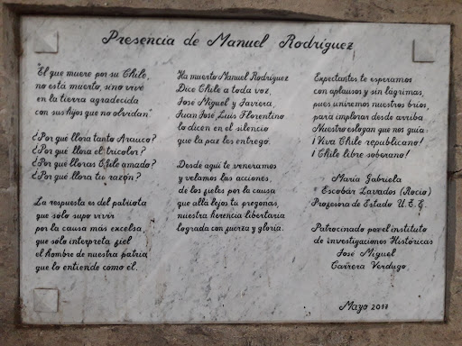 Read moreLugar histórico, inaugurado el 26 de marzo de 1863, representa los esfuerzos patriotas por la independencia de Chile. Se ubica en un entorno de naturaleza apacible, tranquilo que invita al descanso y la reflexión, muy representativo de los albores de la independencia de Chile. De fácil acceso, ubicado en la carretera G-16 a 4 kms de Til Til, frente a la "Cancha del Gato". Cuenta con una instalación de piedras grabadas con poemas dedicados al héroe, escritos por destacados poetas chilenos. Los 26 de mayo el pueblo de Til Til rinde homenaje, honores militares, misa, desfile, música. Visitar éste lugar es...