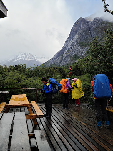 Read moreCuernos was the second refugio on our W Trek (Chileno, Cuernos, Paine Grande, Grey). It took us 6 hours 15 minutes for 8.5 miles from Chileno.||You walk down to the reception/main lodge/lounge to check-in. Then walk back up to the eight perched cabins. We got No. 7, which was fine, though far from the bathroom. Cabins 4, 5, 6 have the best views while 1-2-3 have no views. ||There are two single beds, a tiny nightstand, some pegs, a wood stove they will stoke for you during dinner, and a little porch, where a hawk landed for a while. It was quiet and relatively comfortable beds and blankets. The stove actually made the small room too hot initially.||The bathrooms, like all the refugios, were segregated, with some toilet stalls, and a few showers, which were hot, while the basins were cold. As in other refugios, there was a kiosk for buying wifi: about $16 for 10 hours. There were two dining/lounge areas and they are strangely strict about placing you in specific seats along the hard benches. ||Our dinner, basically repeated at every refugio: watery soup, mystery meat, messy mashed potatoes, decent dessert. Breakfast was individual scrambled eggs and toast, and very modest cereal buffets: if you awake later, you might miss out!||Dining tip: they'll ask for food preferences (and passports) when you check-in. If you say "no red meat," you'll hopefully get chicken, which was the best thing we ate. Or you may get vegetarian, which I found mostly inedible. Better still, treat yourself to...