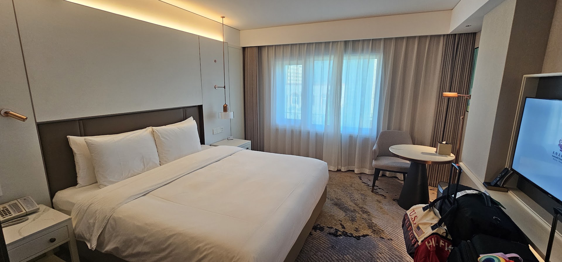 Read moreThe hotel is located in busy downtown Beijing. It’s very central to lots of malls and a pedestrian only shopping strip. Lots of restaurants to choose from.||Negatives|Hotel is currently being renovated so noisy during the day. I did not know this as i booked months earlier. However they did inform me a week or so before we arrived.||For some reason they did not let us put room service dining to our room. We had to pay every single time.||We had a do not disturb on our door and at midnight room service rang our door bell while we were sleeping and the order was not for our room.||Room dining was average so its best to go outside for a meal||You have to wear a swimming cap in the pool so you had to buy one or you couldn’t use it. Pool also had cameras everywhere so didn’t feel comfortable having people in a room looking at us while we swam and relaxed. Only used the pool once because of this.||We had noisy neighbours with kids running up and down the floor.||TV only had a couple of news channels in english and movies were only a handful of good ones and the rest D grade movies you never heard of. We had to watch movies over and over again or the depressing news channels. You could stream however was advised to follow their laws so no Netflix, Apple TV or YouTube using their wifi||Positives|English speaking front desk|Great location|You could buy toiletries and robes from front desk|4 bottles of water given daily|Hotel is new |Smelt great everyday|Had double windows so you could not hear...