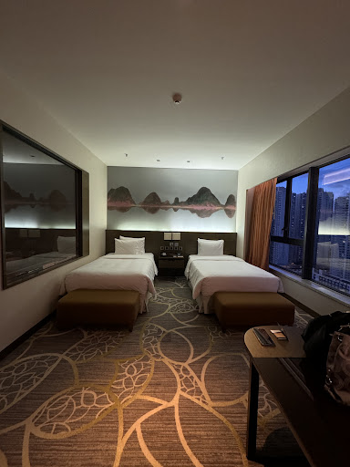 I booked a high floor room and was assigned a room on the 45th floor away from the lift which I requested. The room was spacious and very clean with a decent view of the town and beyond. The bed wasn't too bad with the mattress being reasonably firm. Guests booking these rooms have a compact fridge which came in useful and was stocked with 5 free of charge complimentary drinks (combination of soft drinks and lager). The bathroom was a good size with separate bath tub, shower and toilet. Other standard items included tea/coffee making facilities (not many sachets of tea, coffee, Chinese tea), although a coffee machine would have been a nice touch, iron/ironing board, slippers. There was a decent storage area for luggage and clothes hanging. I didn't use the restaurants in the hotel so am unable to comment. Housekeeping was efficient and unobtrusive - I opted for my bed to be made for every day for the duration of my stay, although they kindly changed the bath towel and foot mat every day. I would have been happy for things to be left as is.