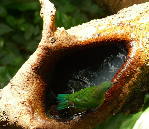 During a recent visit, we were entertained by a green leafbird taking a bath in a rotted tree hole that had water inside. This was enjoyable to see. There are also some beautiful Black-capped Lory birds here that are quite comfortable with people. They often walk on the deck rail right past people, getting quite close. This makes for good photos and great sights of young children with looks of amazement on their faces, as the lorys casually walk right past them.
